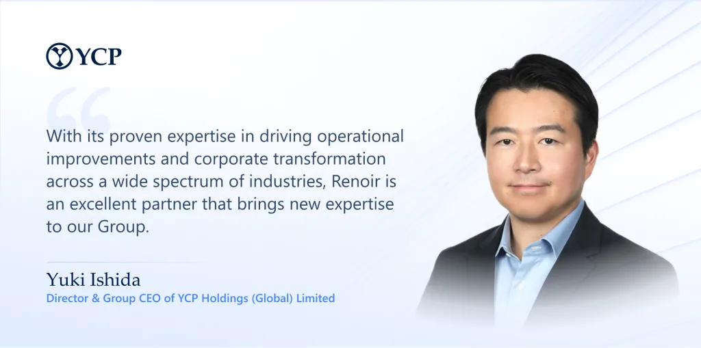 “Since our listing in 2021, YCP Holdings has been actively promoting the standardization and sophistication of our services, while expanding the range of industries we serve, in order to deliver sustainable growth for all stakeholders,” says Yuki Ishida, Director and Group CEO of YCP Holdings (Global) Limited. “With its proven expertise in driving operational improvements and corporate transformation across a wide spectrum of industries, Renoir is an excellent partner that brings new expertise to our Group. Through this integration, we will further expand our capabilities to provide end-to-end support—from strategy formulation to execution and continuous improvement—and accelerate our growth as a professional firm leading Asia.”